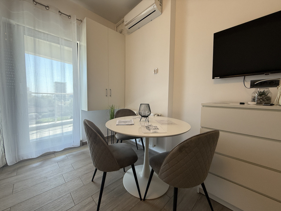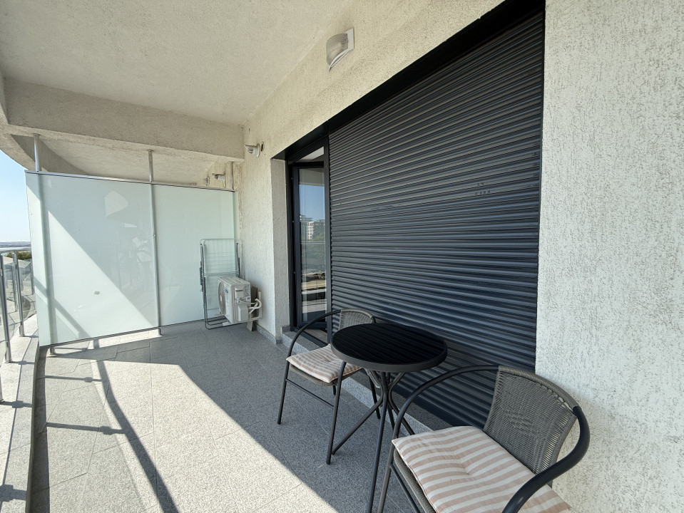 Proprietatea beneficiază de un balcon generos de 8,4 mp, perfect pentru momentele de relaxare în aer liber, cu vedere parțială spre mare sau către ambientul modern al complexului.