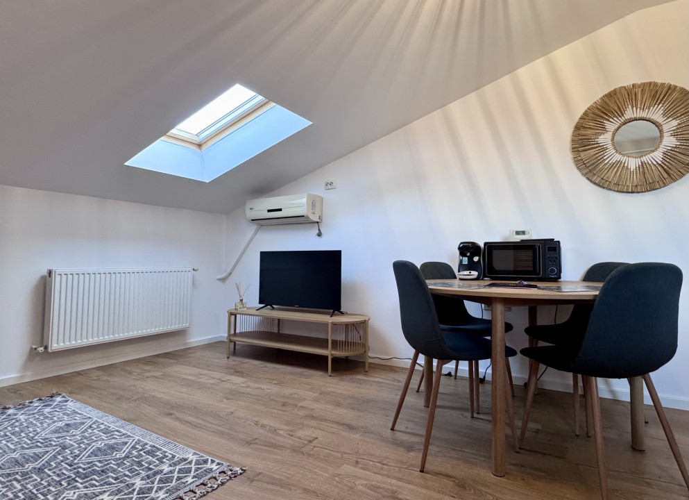 • living luminos cu bucătărie open-space, dotat cu toate obiectele necesare