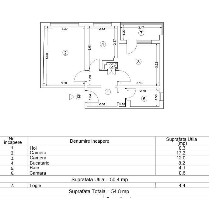 Suprafață totala: 54,8 mp din care 4,4 mp reprezinta balconul pozitionat pe dormitor