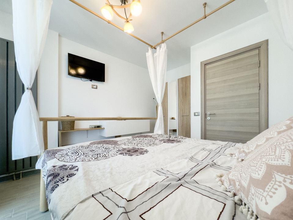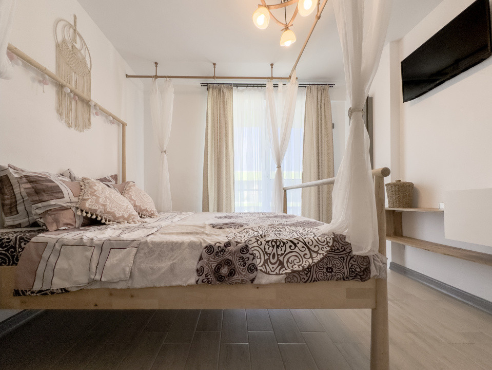 Dormitorul bine luminat natural este refugiul perfect pentru odihnă și relaxare.