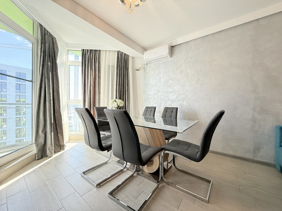 Apartamentul este situat la etajul 8/8, într-un bloc modern cu 2 lifturi, având o suprafață utilă de 47 mp și un balcon de 5 mp cu vedere laterală la mare.