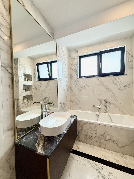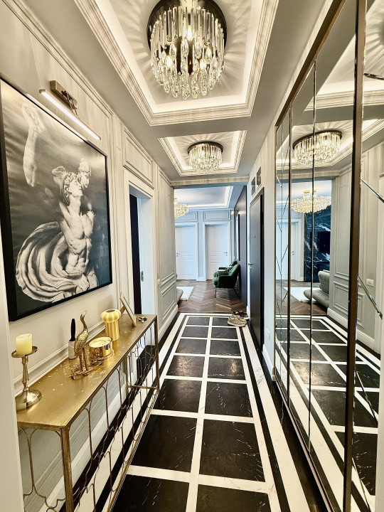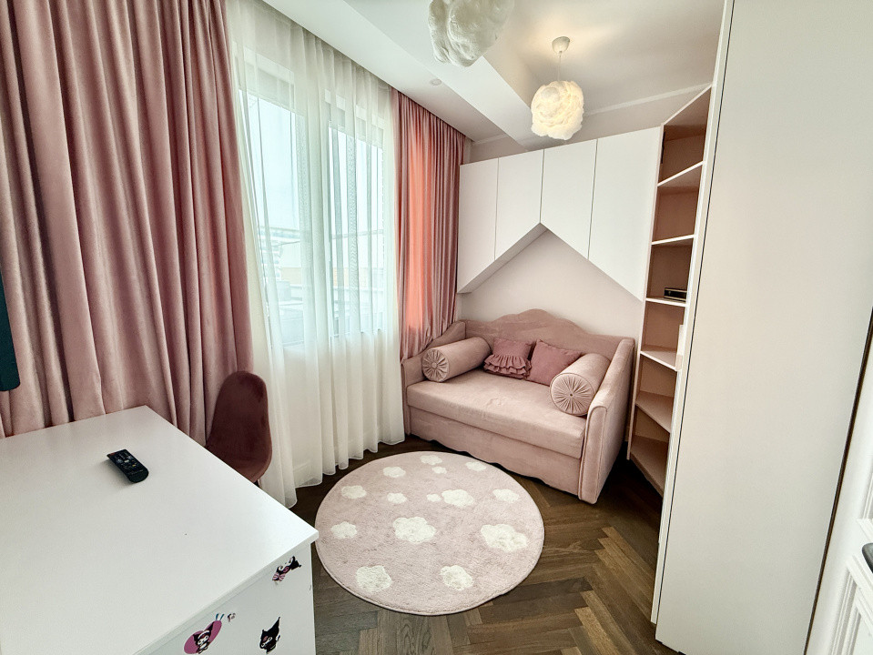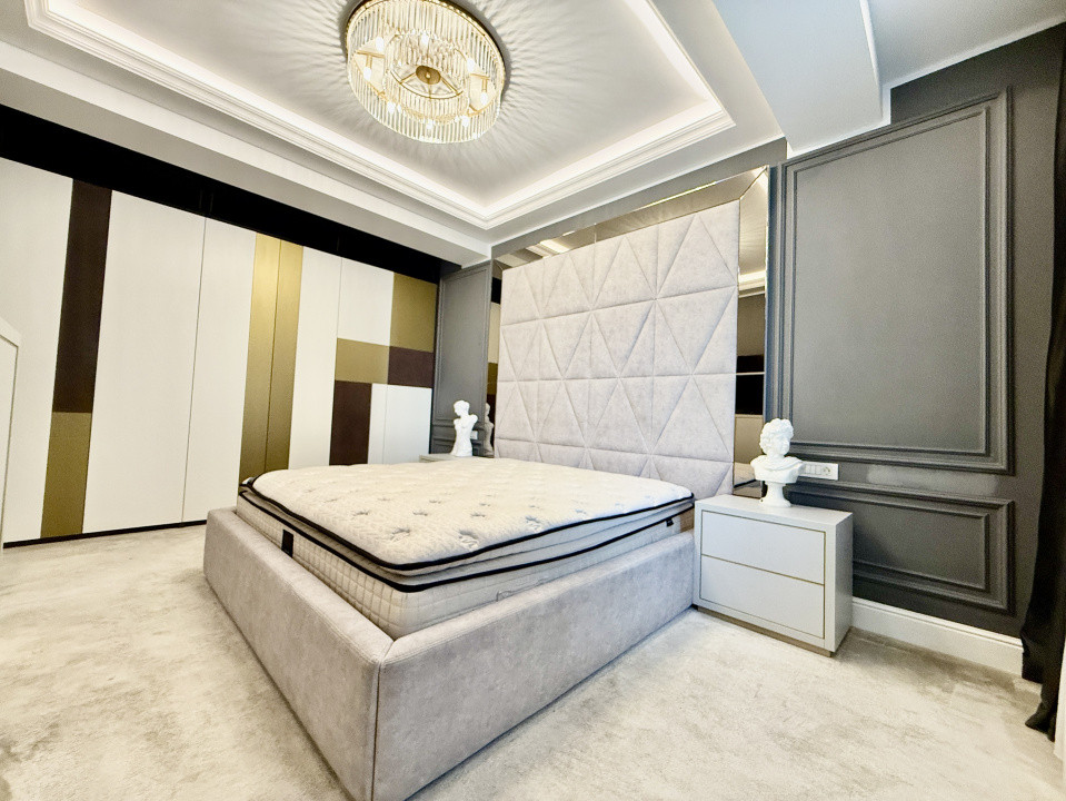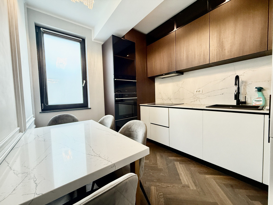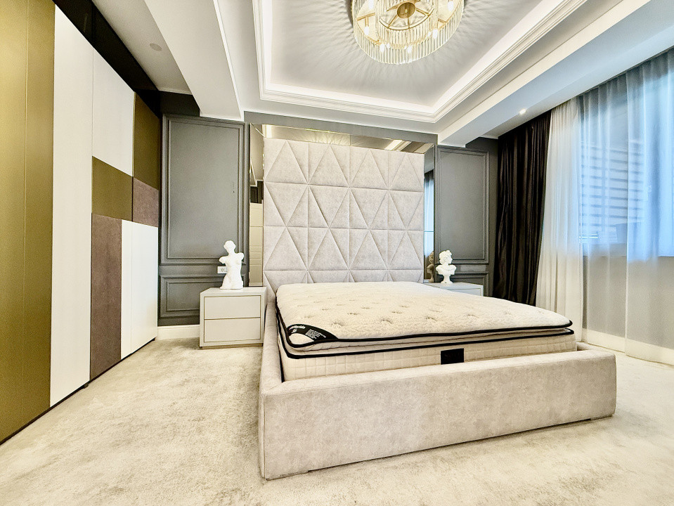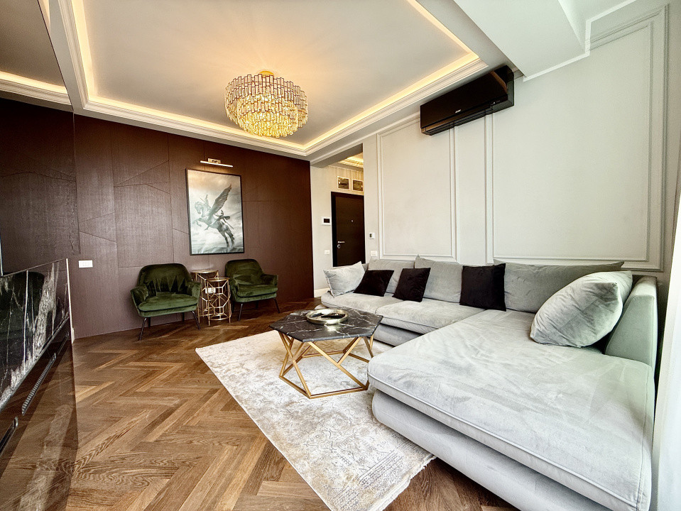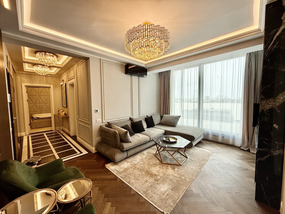 Interiorul este complet mobilat si utilat lux, fiecare detaliu fiind gandit si realizat cu ajutorul unui designer. Apartamentul dispune de mobilier pe comanda de la branduri renumite, parchet din lemn masiv si finisaje premium din marmura, oferind un ambient rafinat si modern.