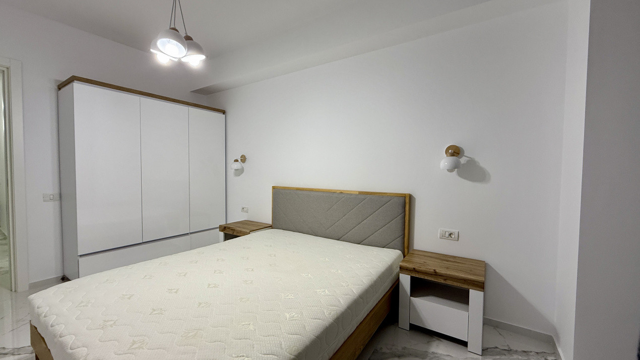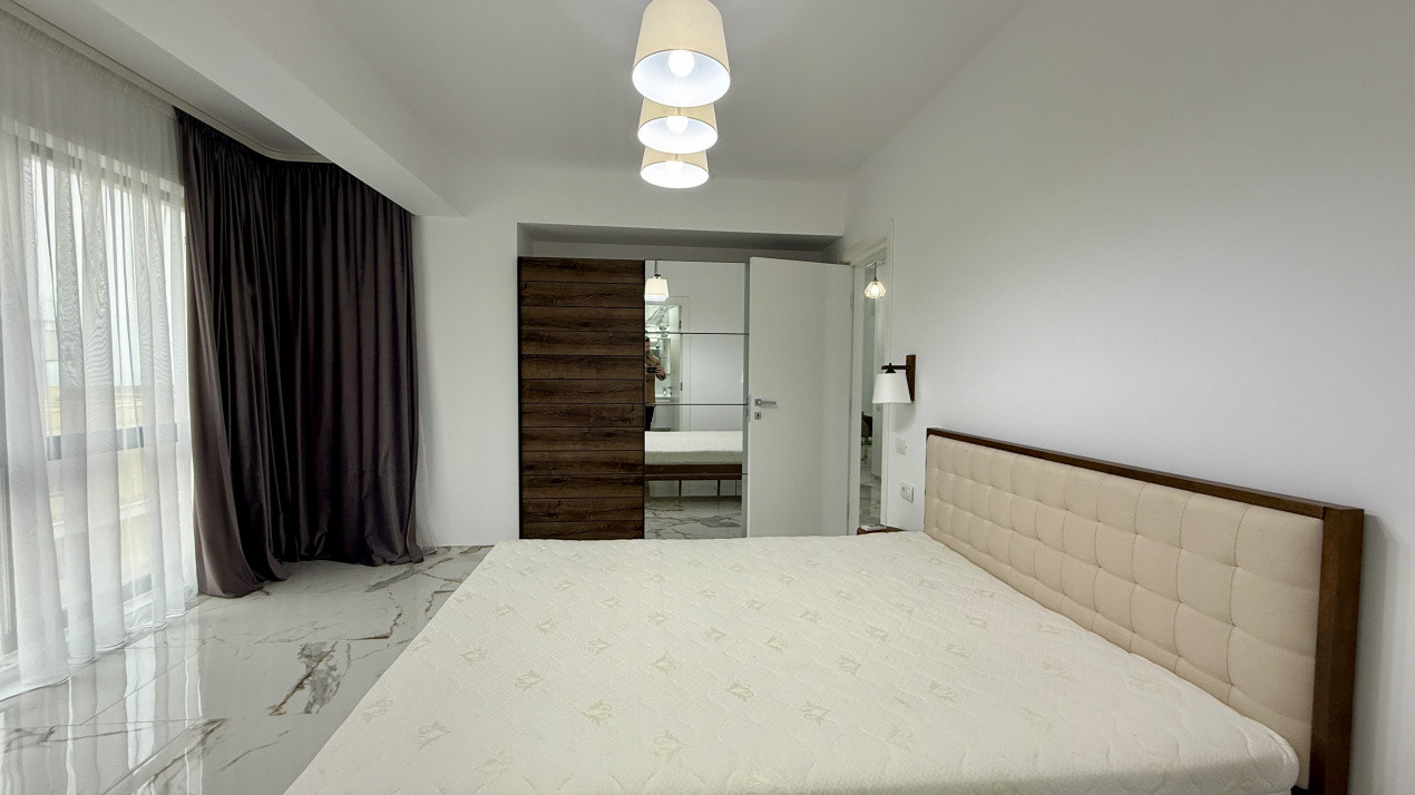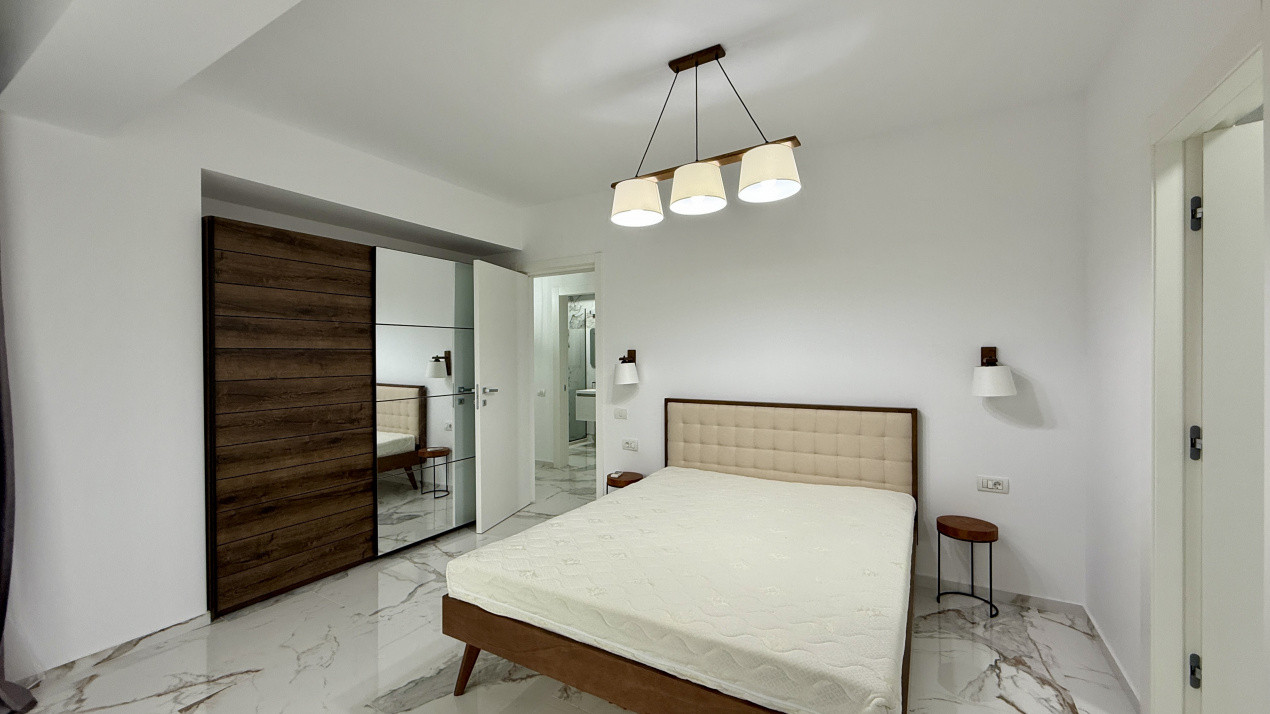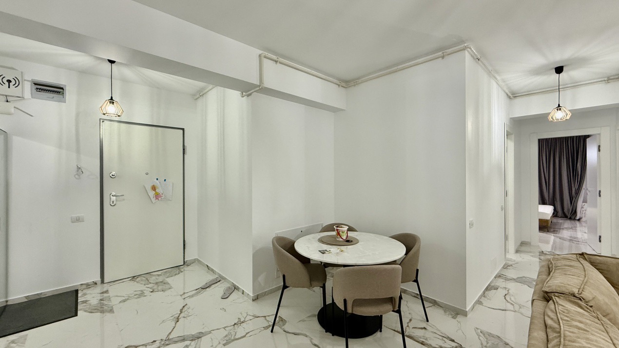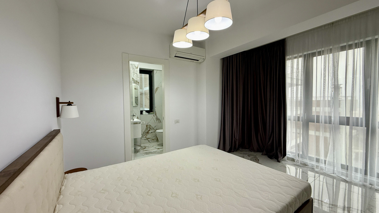 Compartimentare functionala cu zona de noapte retrasa unde regasim cele 2 dormitoare, unul dintre ele cu baie proprie. Zona de zi dispune de living, dining si bucatarie open space dar si cea de-a 2-a baie pentru ospeti sau cel de-al 2-lea dormitor.