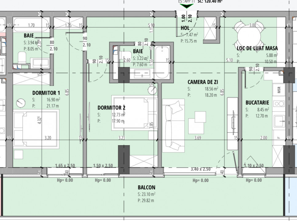 Compartimentare eficientă: bucătărie închisă, 2 dormitoare, 2 băi