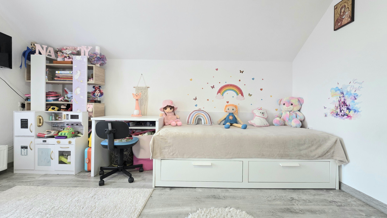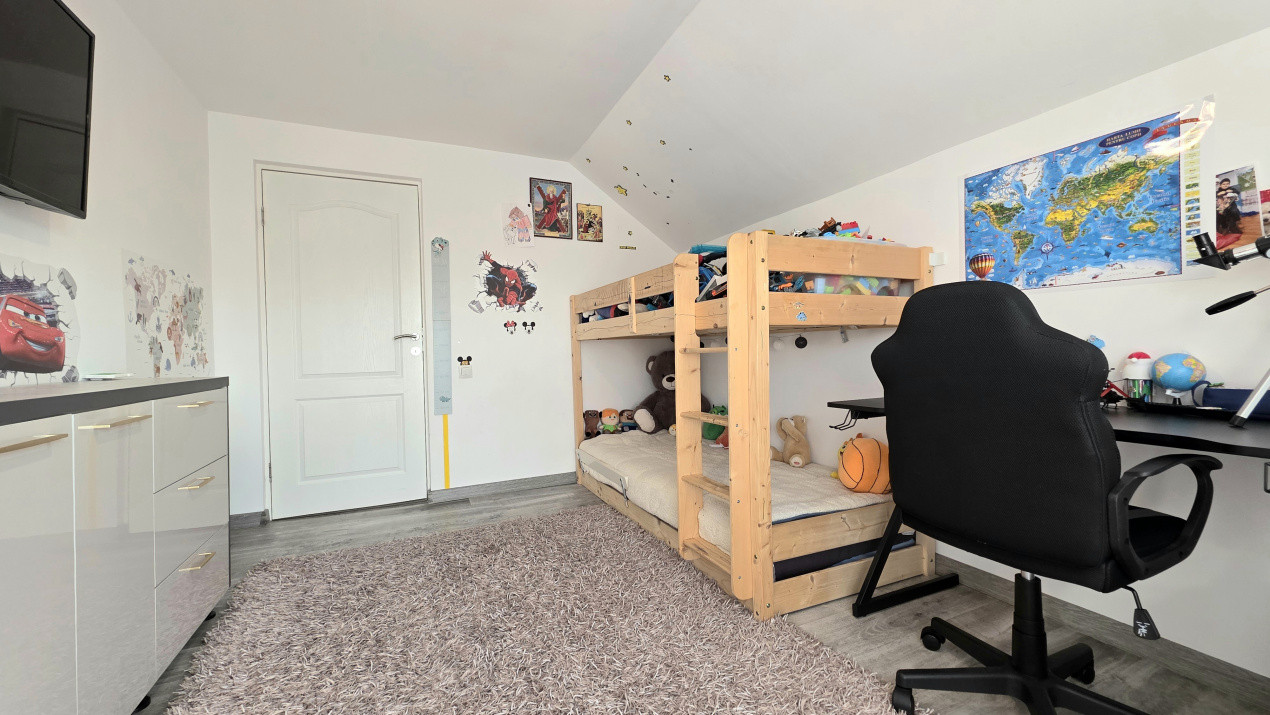 * Etaj primitor: 3 dormitoare luminoase, o baie dotata cu cada si un hol ingenios transformat intr-o a doua zona de relaxare. Unul dintre dormitoare dispune de un balcon de 5 mp, ce poate fi Ʈnchis pentru un plus de spatiu;