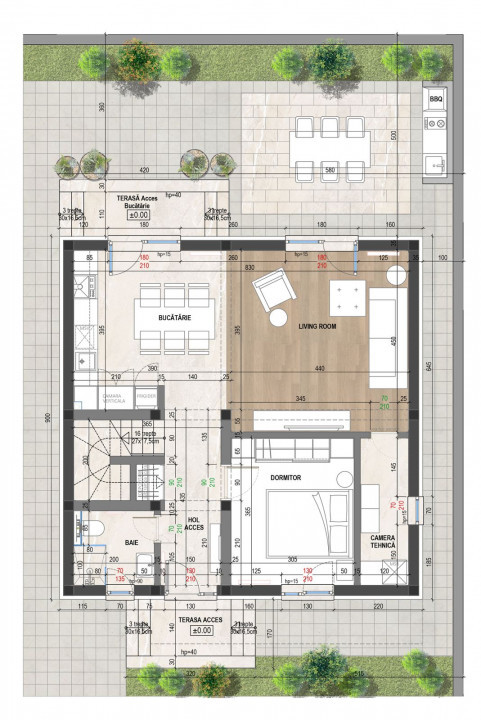 - Bucatarie ( cu acces direct catre terasa exterioara )