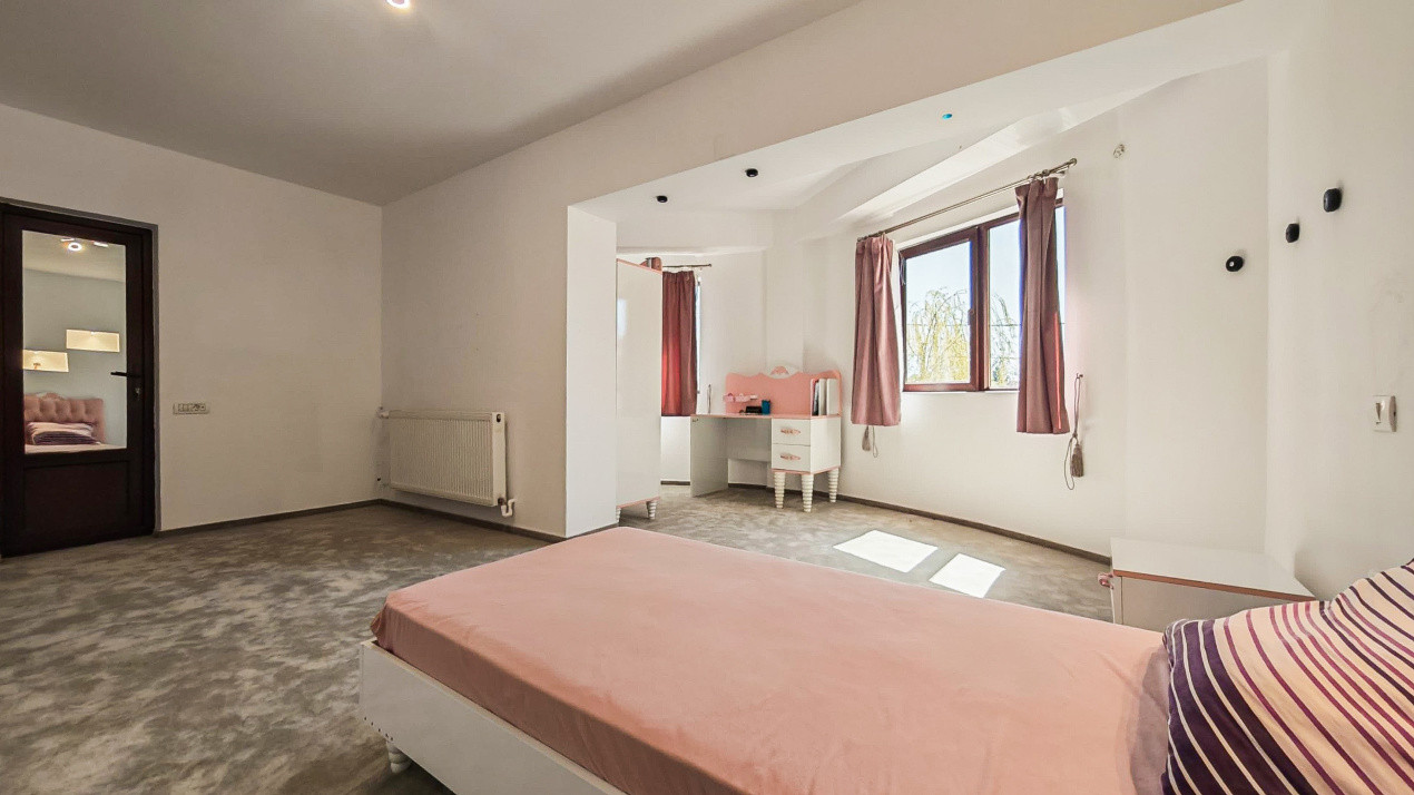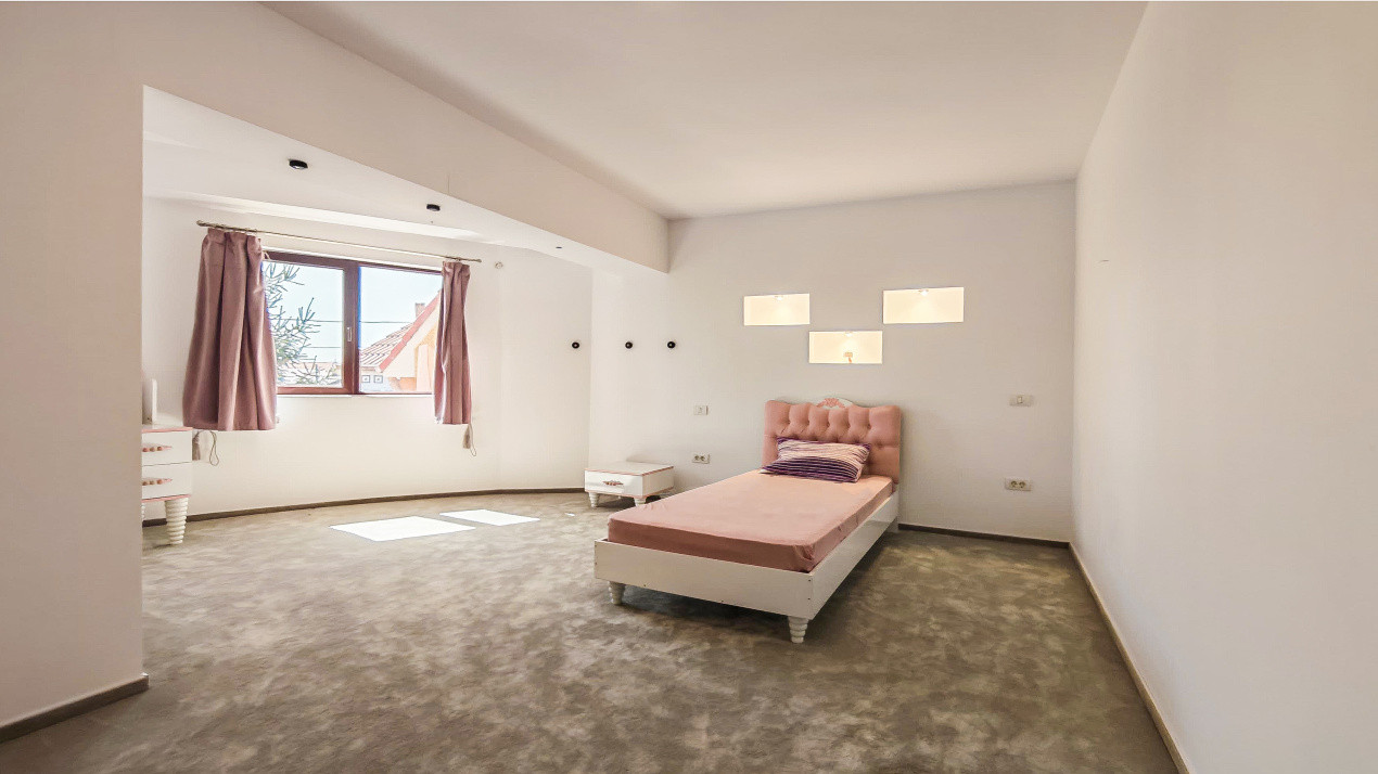 Vila dispune de 6 dormitoare, fiecare cu baie proprie, oferind intimitate și confort sporit pentru fiecare membru al familiei sau pentru oaspeți. În total sunt 7 băi, iar compartimentarea este gândită eficient, cu spații largi și luminoase, finisaje de calitate și detalii atent alese. Relaxarea este completată de un jacuzzi privat, perfect pentru momente de răsfăț și destindere.